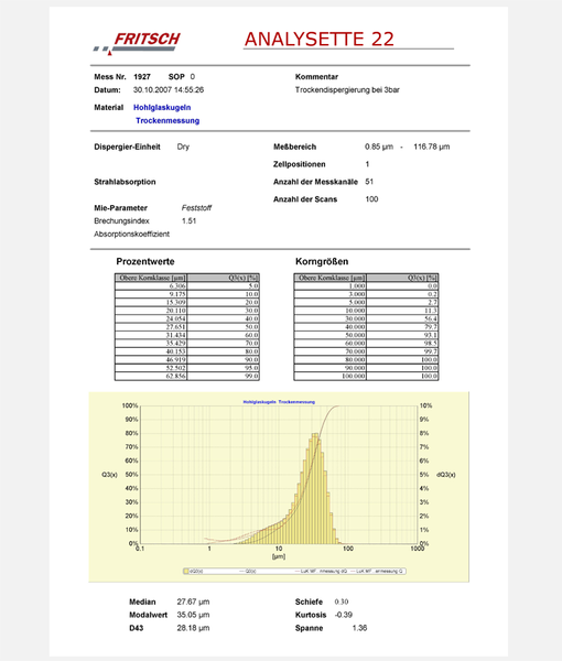 The shown below particle size distribution of hollow glass spheres was achieved with the ANALYSETTE 22 (maximum measuring range: 0.1 – 2100 μm). Performed was the measuring with the use of the dry dispersion unit with an adjusted pressure at the Venturi injectors. Covered was the measuring range from 0.85 up to approximately 116 μm. During the evaluation of the measuring data the Mie-theory was applied, since especially in the area of smaller particle diameters for samples with a small refractive index, an already significant deviation of the calculation according to Fraunhofer is recognizable. For a comparison, also a distribution curve from the Fraunhofer approximation was drawn into the diagram.