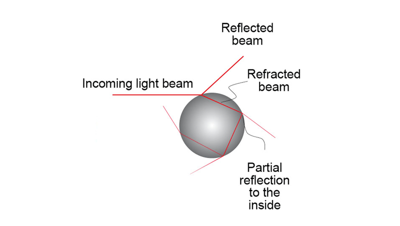 The reflection occurs mostly on the surface of a particle – according to the law which states: angle of incidence is equal to angle of reflection.